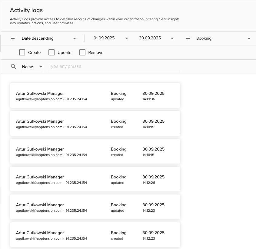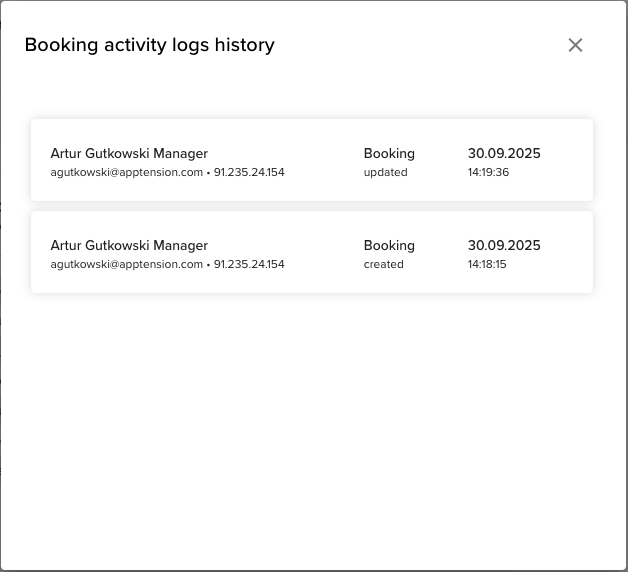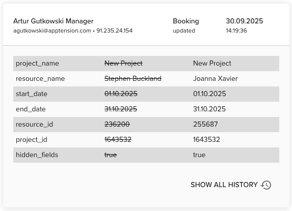 This feature helps managers and administrators monitor important actions such as bookings, timesheets, project updates, and other entities, making it easier to track accountability and ensure transparency.