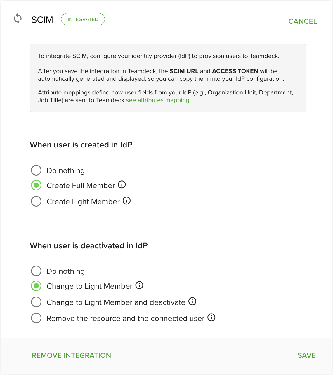 Configure provisioning rules in Teamdeck to control how users are created and deactivated when changes occur in your IdP.