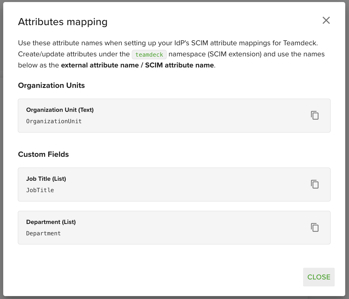 Use the attribute mappings dialog in Teamdeck to view the exact attribute names required for your IdP configuration.