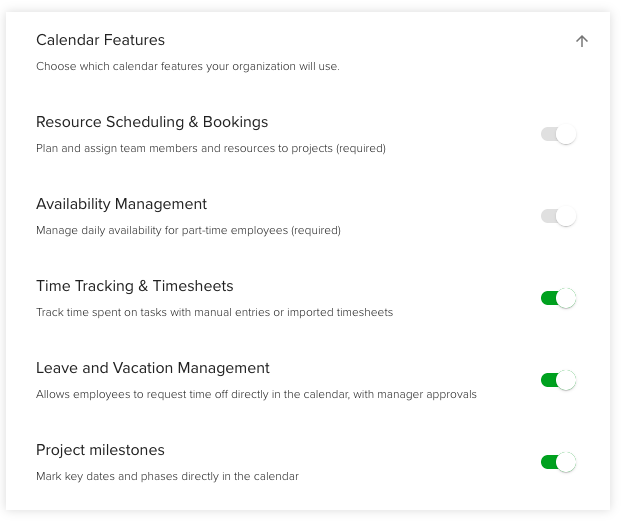 Calendar Features - For organizations that want to just focus on resource planning, Time tracking, Leave Management, and Project Milestones can be disabled.