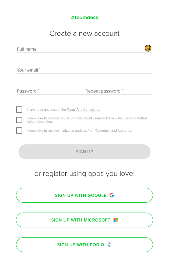 Step 1: Head to the Teamdeck homepage and enter your email to set up a new account. You can also sign up using Google, Microsoft or your Podio account.