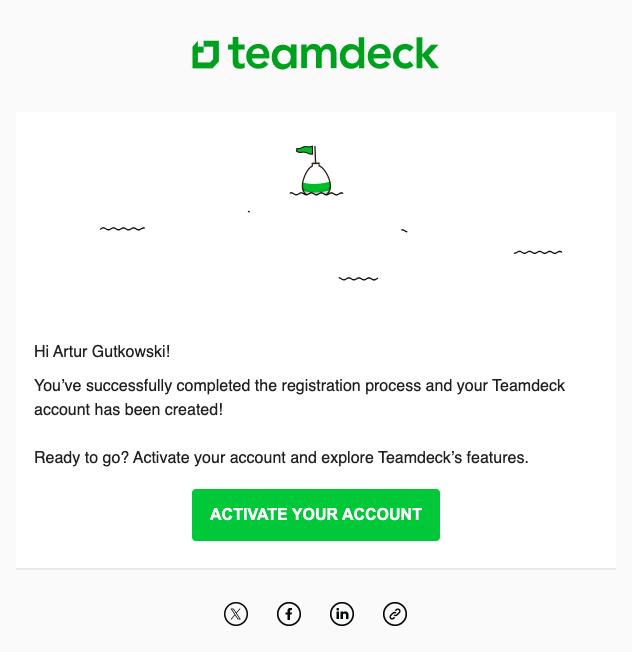 Step 2: Check your inbox - you should see an email from teamdeck entitled Activate your account. Open this email and click on the Go to my dashboard button.