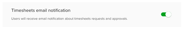 To turn on email notifications that are consistent with in-app notifications, go to Settings -> Advanced -> Notifications and enable "Timesheets email notification."